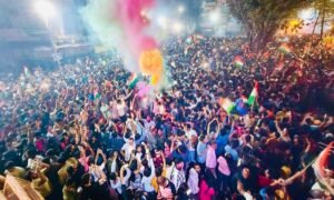 इंदौर: दिन में राजबाड़ा चौक जहां रंगपंचमी में रंगा वहीं रात में भारत की जीत के जश्न में रंग गया. टी-20 वर्ल्ड कप फाइनल में भारत की जीत के बाद बड़ी संख्या में क्रिकेट प्रेमी यहां जुटे. ढोल-नगाड़ों के साथ नाच-गाकर जीत का जश्न मनाया. देर इस दौरान जमकर आतिशबाजी भी की गई. साथ ही रंग भी उड़ाए गए. रात तक उत्साह का माहौल रहा. भारत माता की जय और वंदे मातरम के नारों से पूरा राजवाड़ा गूंज रहा था.