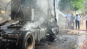 सिंगरौली। जिले के नवानगर थाना क्षेत्र में आज शनिवार की दोपहर एक बड़ा हादसा होते-होते टल गया। सड़क किनारे खड़े एक ट्रक में अचानक भीषण आग लग गई, जिससे पूरा ट्रक कुछ ही देर में जलकर खाक हो गया। हालांकि घटना में किसी प्रकार की जनहानि नहीं हुई है।