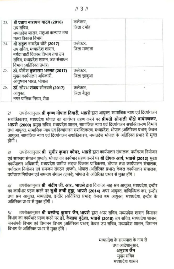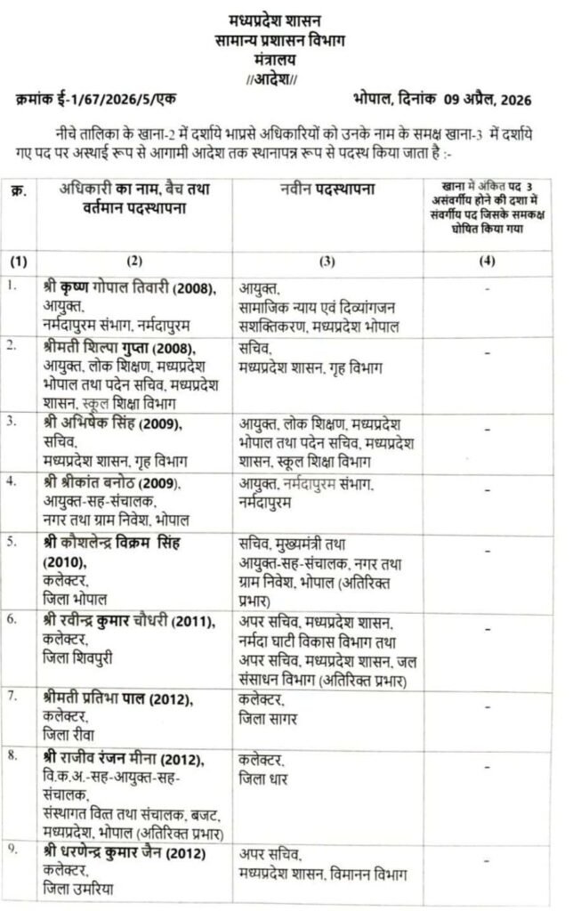 वहीं, कौशलेंद्र विक्रम सिंह को मुख्यमंत्री सचिवालय में सचिव के रूप में पदस्थ करते हुए नगरीय प्रशासन विभाग में जिम्मेदारी सौंपी गई है। इस व्यापक फेरबदल के तहत दो दर्जन से अधिक आईएएस अधिकारियों की नई पदस्थापना की गई है।