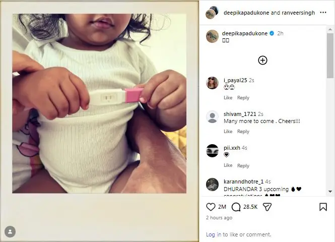 दीपिका ने एक बहुत ही प्यारी तस्वीर शेयर की है जिसमें उनकी बेटी दुआ पादुकोण सिंह ने एक प्रेग्नेंसी टेस्ट पकड़ा हुआ है, जो यह खुशखबरी दे रहा है। तस्वीर में रणवीर और दीपिका दोनों के हाथ अपनी बेटी को बड़े प्यार से थामे हुए देखे जा सकते हैं, जो अब एक बड़ी बहन बनने वाली है। इस घोषणा को बहुत ही सिंपल रखते हुए दीपिका ने कैप्शन में सिर्फ बुरी नजर से बचाने वाले इमोजी लगाए हैं। यह पोस्ट दीपिका और रणवीर दोनों ने मिलकर शेयर किया है।