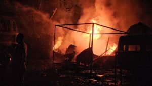 रीवा। शहर के ट्र्रांसपोर्ट नगर में बीती रात अचानक आग लग जाने से 10 दुकाने जलकर राख हो गई. शार्ट सर्किट के बाद टायरो में आग लगी और दुकानो को अपनी चपेट में ले लिया. रात 2 बजे के आसपास लगी आग से दुकाने जलकर राख हो गई. किसी तरह से दमकल ने आग पर काबू पाया.