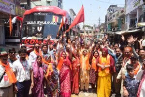 जय श्री राम और हर हर महादेव के जयघोषों के बीच श्री हिंदू उत्सव समिति के अध्यक्ष चंद्रशेखर तिवारी, पार्षद सरोज हरिओम आसेरी सहित अन्य जनप्रतिनिधियों और गणमान्य नागरिकों ने ध्वज दिखाकर यात्रियों को विदाई दी। इस दौरान पूरा क्षेत्र केसरिया रंग में रंगा नजर आया और श्रद्धा-उत्साह का माहौल बना रहा।